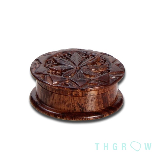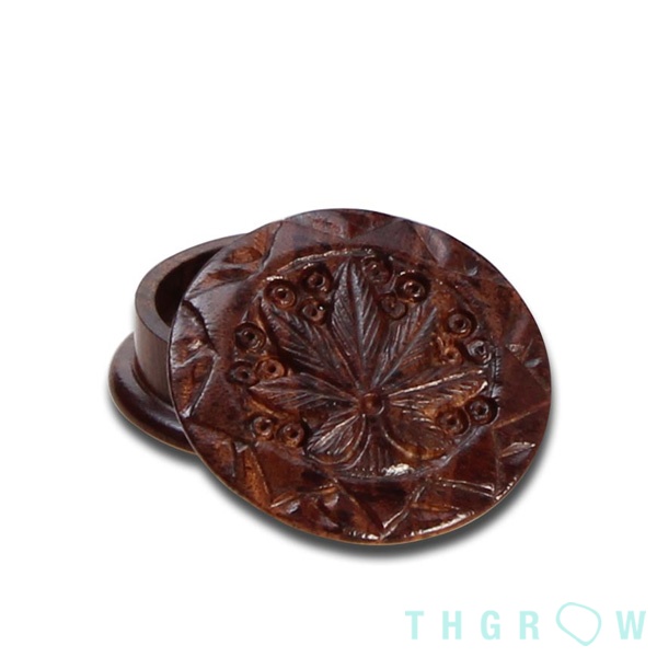 Este grinder artesanal está fabricado en madera de palosanto, un material valorado por su gran resistencia y su estética natural de tonos oscuros y veteados profundos. Su diseño destaca por una tapa superior que exhibe una hoja detalladamente tallada, lo que le confiere una identidad visual única y un relieve agradable al tacto. Con un diámetro de 35 mm, se define por su formato compacto, ideal para usuarios que requieren una herramienta portátil y discreta para el uso diario. El sistema interior cuenta con púas metálicas resistentes, ubicadas estratégicamente para asegurar un triturado eficiente y constante. Al estar compuesto por dos piezas, garantiza sencillez en el manejo y una larga vida útil sin complicaciones mecánicas. Su tamaño permite transportarlo con total comodidad en cualquier bolsillo, ofreciendo una solución funcional que combina la calidez de la madera noble con un acabado artístico distintivo.
